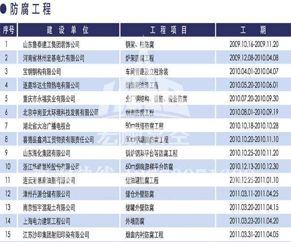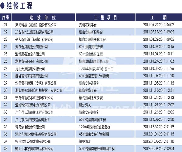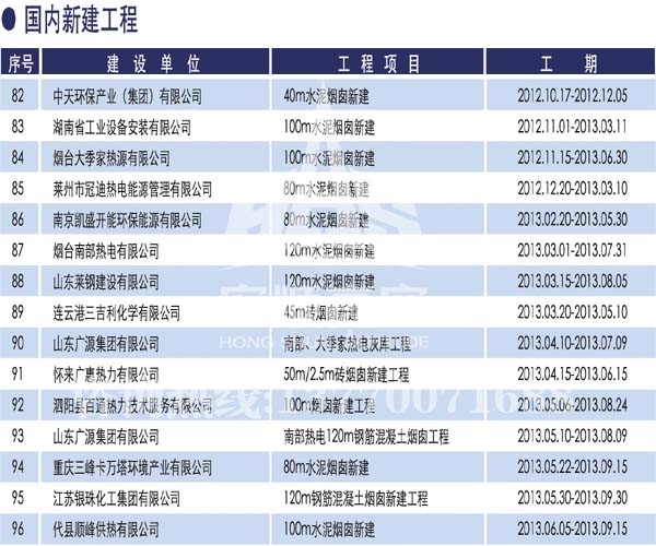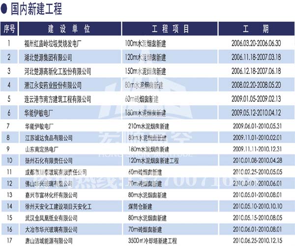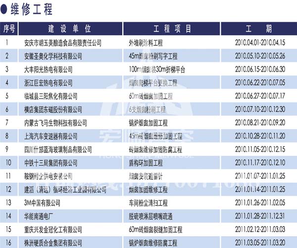 宏順建設(shè)工程有限公司是國家批準(zhǔn)成立的專業(yè)高空作業(yè)企業(yè):承攬過(國內(nèi).國外)煙囪新建、煙囪防腐、吊機(jī)防腐、水塔防腐、管道防腐、龍門吊防腐、儲存罐防腐、煙囪內(nèi)壁防腐等高空作業(yè)工程。具有“不搭腳手架 、 不需要停產(chǎn)”施工特點。